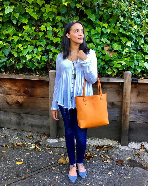 Danelle is looking good all day with her FREELANCE tote... heading into the office in the morning with her laptop, then to her favorite deli for lunch, meeting friends for happy hour and finally retiring back home to her 3 kids. This rolled handle medium sized tote is available in Sunset brown (shown), Chocolate brown or Black and comes with a convenient interior pocket.
